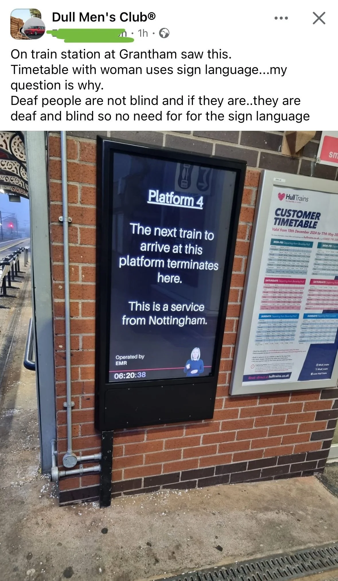 I came across this in a Facebook group, where someone shared a photo from Grantham Station in England. The digital display includes British Sign Language (BSL) interpretation alongside the text—an amazing example of inclusive design in public transport!
